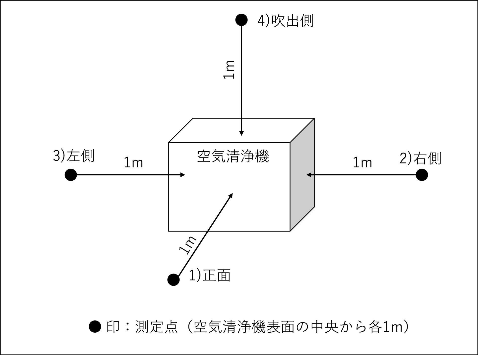 騒音試験は、無響室内に空気清浄機を設置し、吹出し側を含む4カ所における騒音を、JIS Z8731で規定する方法により測定します。