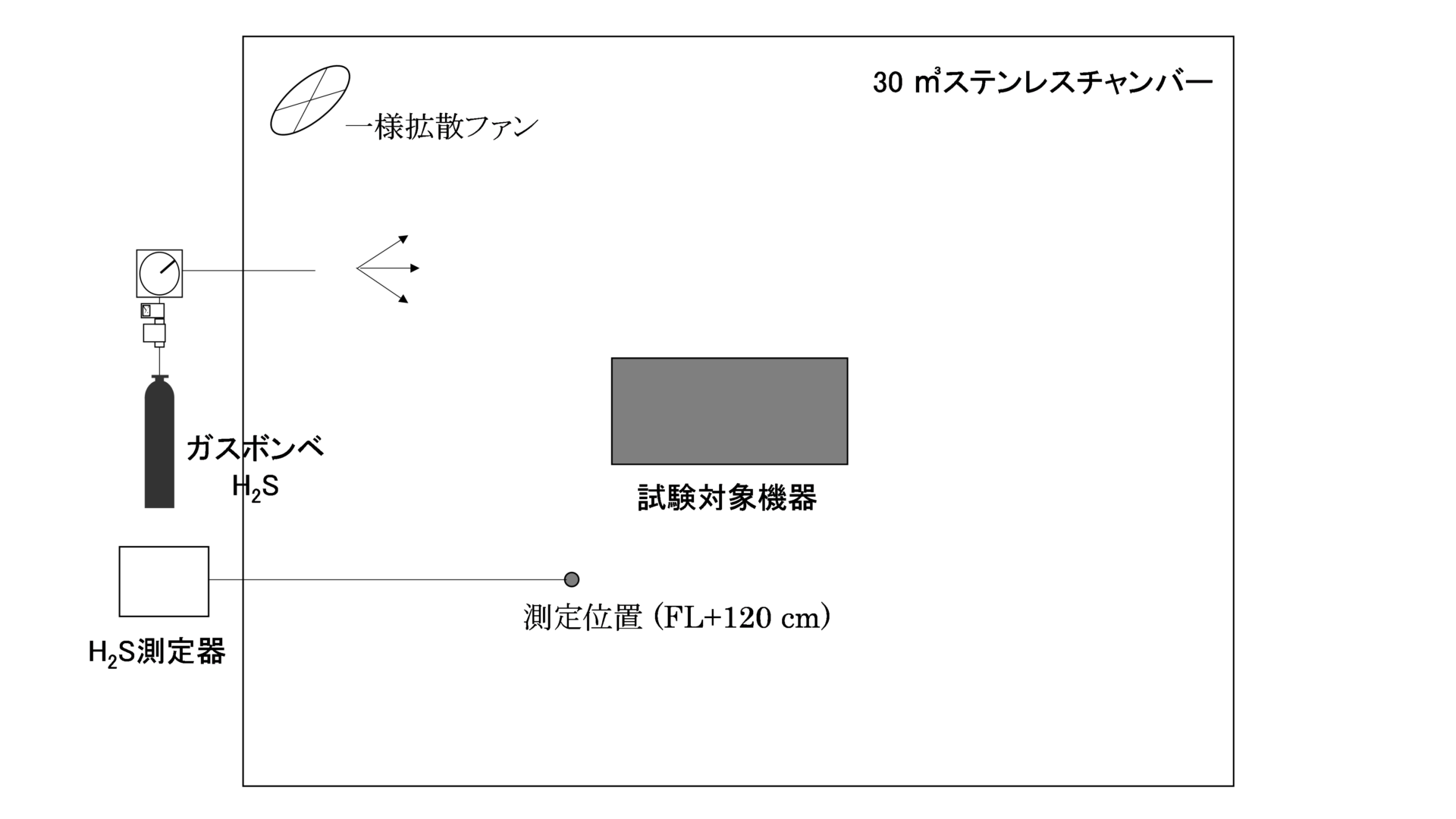 環境制御型チャンバー内において、硫化水素、二酸化硫黄等の腐食性ガスを一定濃度に調整し、試験品を曝露させて耐久性の評価をします。