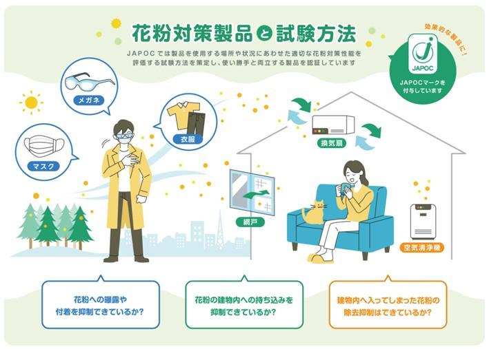 花粉問題に取り組む企業、研究機関が中心となり組織された「花粉問題対策事業者協議会(JAPOC)」では、花粉対策製品の試験評価方法と認証基準を定めています。