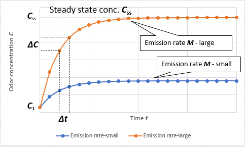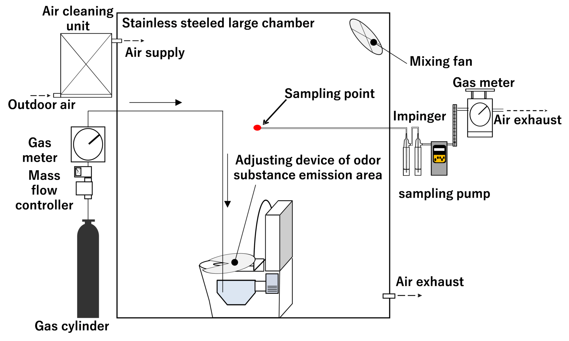 チャンバー内に脱臭便座および便器を設置し、便器内から屎尿由来のガスを定常発生させ、実際のトイレ使用時の状況を再現します。この状況で、脱臭機能を使用した場合と使用しない場合のチャンバー内濃度上昇性を比較することで、脱臭性能を評価します。